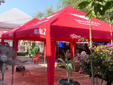 เต็นท์ทรงจั่วพร้อมสกรีนสีและสกรีนผ้าใบ สกรีนเต็นท์ ผลิตผ้าใบกันสาด ป้ายโฆษณา รับผลิตเต็นท์พร้อมสกรีนโลโก้พร้อมติดตั้ง